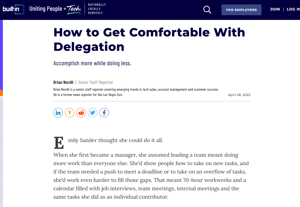 I was excited to speak with Brian Nordli from BuiltIn recently on the important topic of delegation. Some other great contributors were interviewed for the article as well. If you want some great perspectives, strategies, stories, and tangible tips on delegation, I’d encourage you to read the full article.